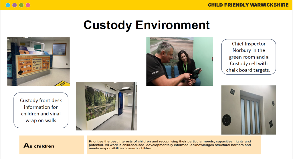 • The Child First Commendation is for work that has taken place alongside Warwickshire Police to make the custody environment more child-friendly within Nuneaton and Leamington cells. The intention is also to give the Police a greater understanding of the Trauma journey that children may have faced before entering the custody environment. This is an excellent example of developing culture and climate as well as practice and provision and is appreciated by children and families. One officer described how the inclusion of reading material in the custody suite was appreciated by one young person, who gratefully accepted the offer to take the book with him when he left: it was the first book he was ever given…