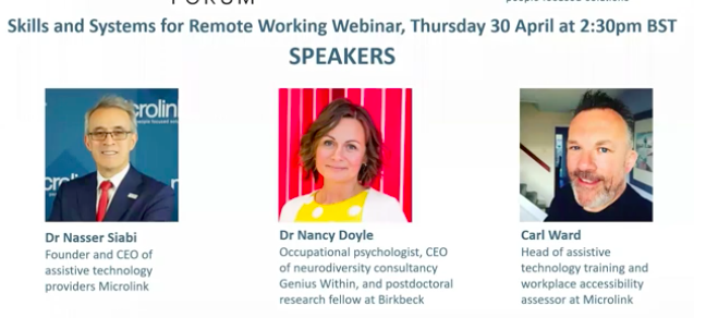 Siabi was joined by Dr Nancy Doyle – an occupational psychologist, CEO of neurodiversity consultancy Genius Within, and postdoctoral research fellow at Birkbeck University ­– and Carl Ward, Microlink’s head of assistive technology training and a workplace accessibility assessor. Building on the advice presented in a recent article, Doyle’s presentation focused on reconciling work responsibilities with family duties and leisure time; maintaining focus in a busy home environment; smoothing tensions between colleagues at a time when in-person communication is out of the question; and supporting colleagues.